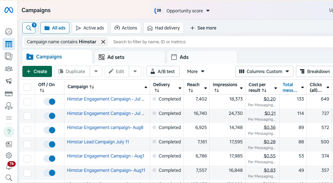 I managed multiple Meta Ads campaigns for Himstar, focusing on lead generation, sales, and awareness ads. These social campaigns increased reach, attracted high-quality interactions, and improved purchases at a lower cost.