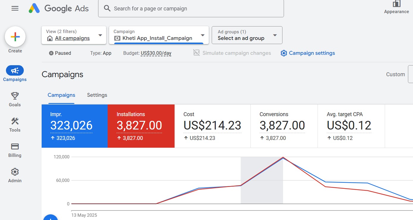 In one of my Google Ads campaigns, I achieved 323K impressions and 3.8K app installs at just $0.12 CPA. By targeting the right audience and optimising campaign details, I ensured effective and cost-efficient results.